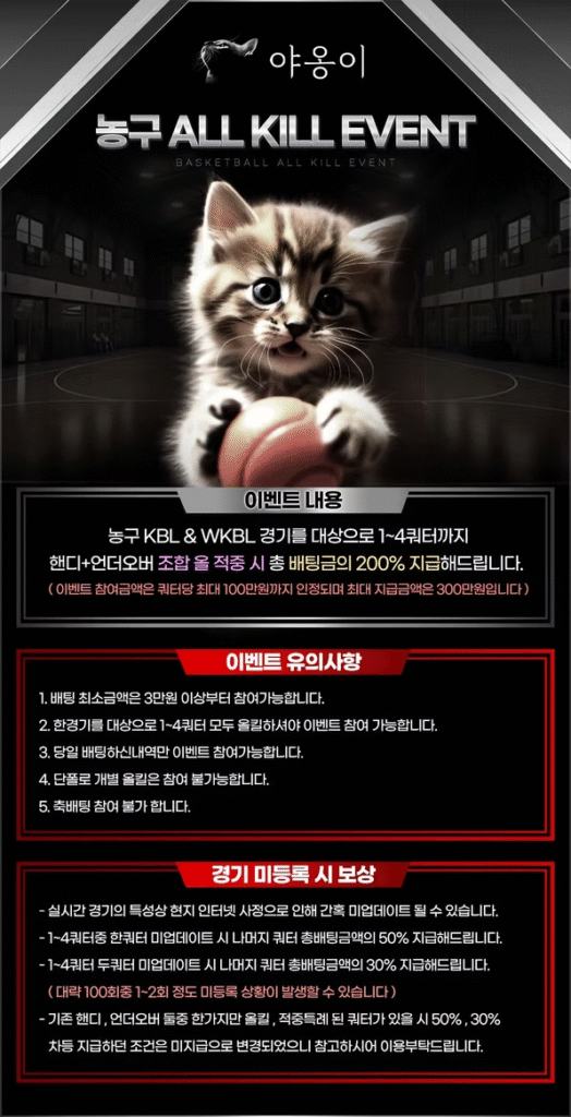 야옹이카지노의 농구 올킬 이벤트는 실시간 배팅의 긴장감을 배로 즐길 수 있는 기회입니다.