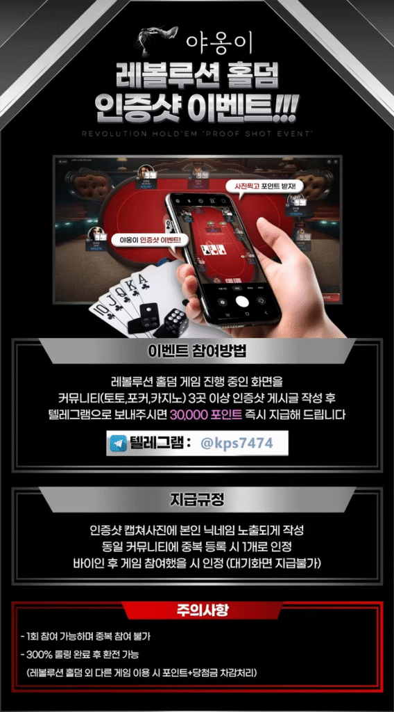 레볼루션 홀덤 게임 화면을 캡처하여 커뮤니티(토토, 포커, 카지노) 3곳 이상에 인증샷 게시물을 작성한 후, 해당 게시물 링크를 텔레그램으로 전달하면 즉시 30,000 포인트가 지급됩니다.