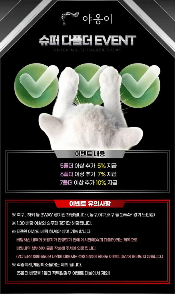 단순히 적중만으로 끝나는 것이 아닌, 폴더 수에 따라 더 큰 보상을 받을 수 있는 야옹이카지노 슈퍼 다폴더 이벤트를 통해 전략적인 배팅의 재미를 경험해보시기 바랍니다.
