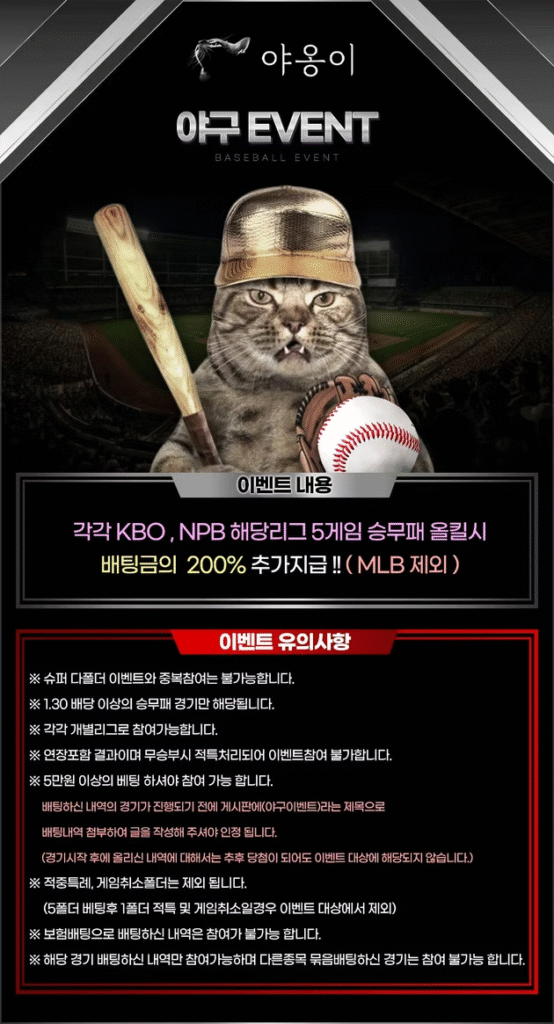 야옹이카지노에서는 야구 시즌을 맞이하여 KBO와 NPB 경기를 대상으로 한 특별 이벤트를 진행합니다.