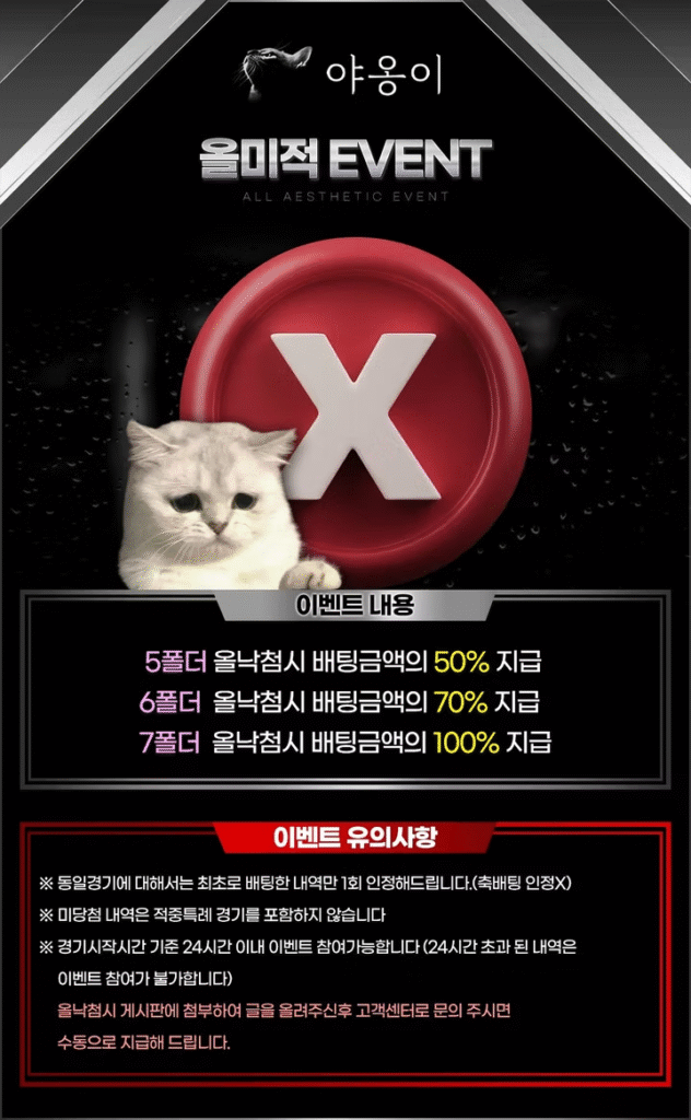 야옹이카지노에서는 아쉽게도 모든 경기를 놓친 유저들을 위해 특별한 보상 이벤트를 준비했습니다.