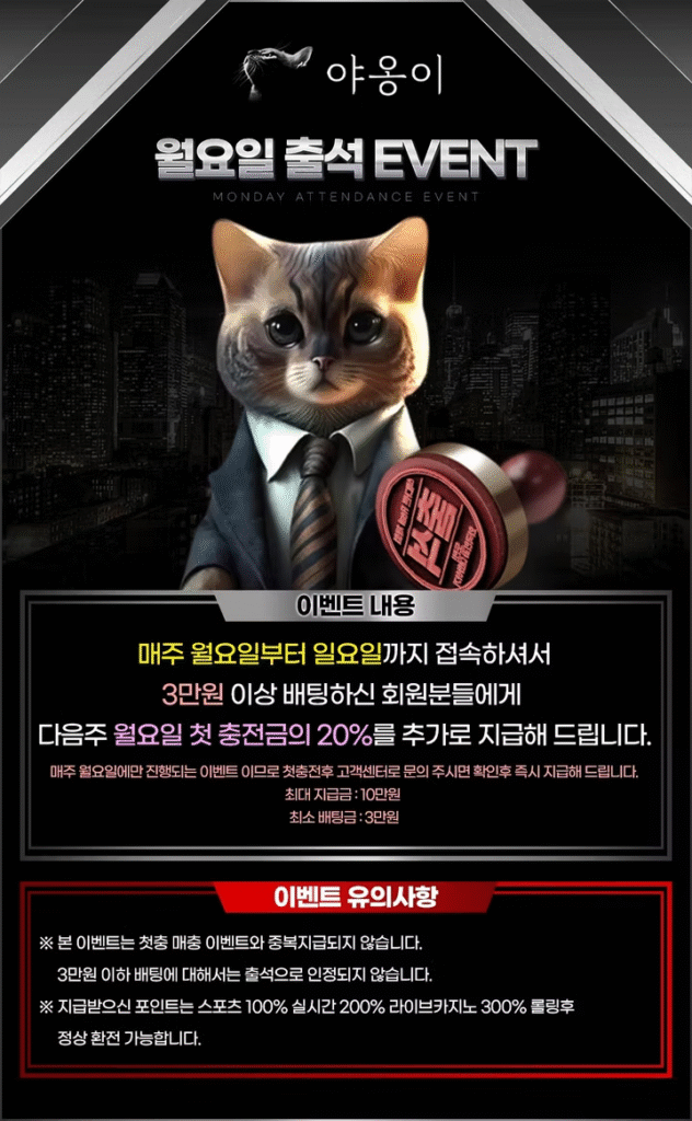 매주 꾸준히 출석하며 배팅에 참여하는 회원들을 위한 야옹이카지노의 월요일 출석 이벤트가 시작됩니다.
