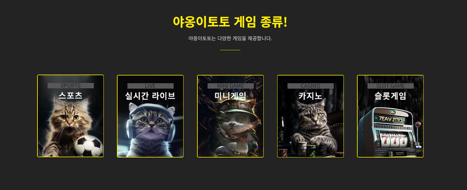 야옹이카지노는 전반적인 UI 디자인에 고양이 콘셉트를 적극 도입하여, 시각적으로 차별화된 사용자 경험을 제공합니다. 메인 화면부터 서브 카테고리 구성에 이르기까지 귀엽고 감각적인 고양이 캐릭터가 배치되어 있어, 카지노의 전통적이고 무거운 분위기를 벗어나 보다 친근하고 위트 있는 인상을 심어줍니다.