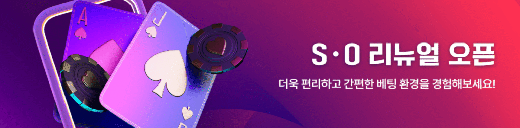 S·O카지노는 이용자의 편의성과 접근성을 강화하기 위해 전체 플랫폼을 새롭게 개편하였습니다. 이번 리뉴얼을 통해 안정적인 서비스와 효율적인 베팅 환경을 동시에 제공하며, 모든 시스템이 한층 더 직관적으로 개선되었습니다.