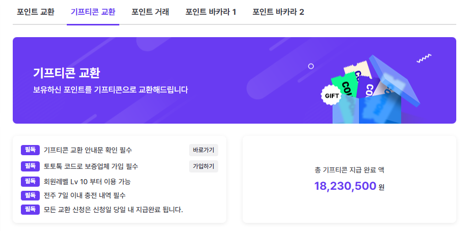 교환 페이지에는 교환 조건과 안내 사항이 함께 정리되어 있으며, 이용자는 일정 조건을 충족했을 때 포인트를 활용할 수 있는 흐름을 가지게 됩니다.