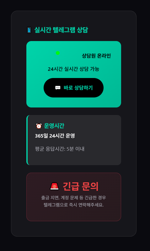 출금 지연, 계정 오류, 이중 결제 등과 같은 긴급 사안에 대비한 전용 상담 라인이 마련되어 있습니다. 이러한 긴급 문의 채널은 일반 상담보다 우선 순위가 높게 배정되어, 문제 발생 시 즉각적인 확인과 처리를 가능하게 합니다. 텔레그램 기반의 특성상 사용자는 별도의 절차 없이 바로 접속해 빠르게 상황을 전달할 수 있습니다.