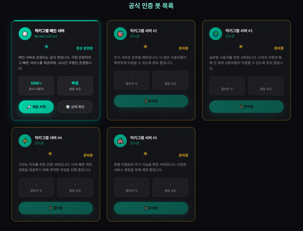 럭키그램다이스는 공식 인증 봇을 통한 접속만을 권장합니다. 이용자들은 안내된 채널과 주소를 확인한 뒤 참여함으로써 보다 안정적이고 원활한 게임 환경을 경험할 수 있습니다.