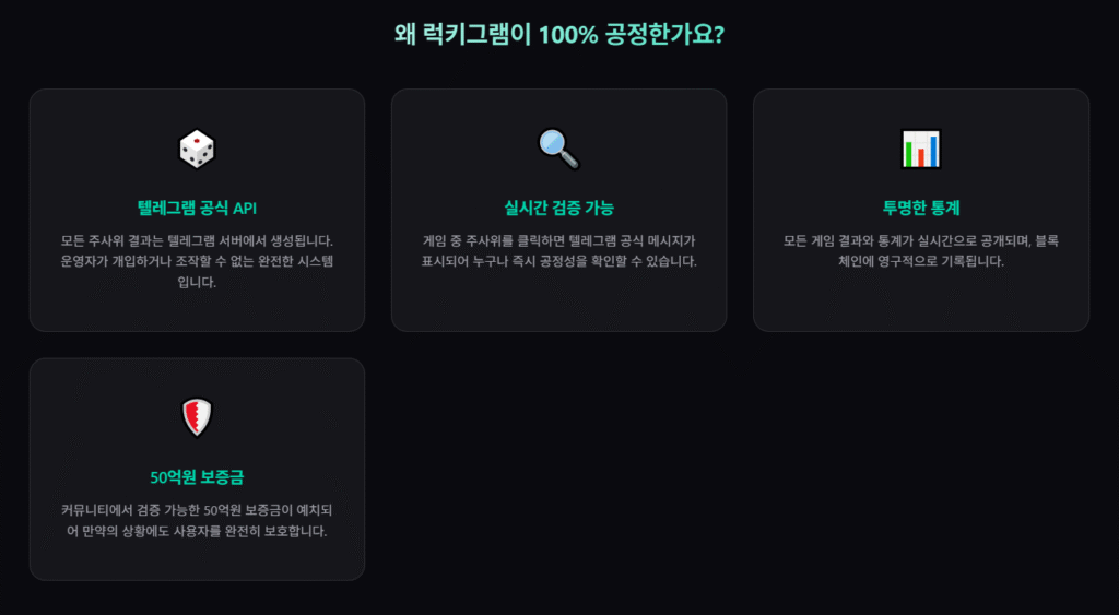 모든 주사위 결과는 텔레그램 서버에서 직접 생성되며, 외부 개입이 원천적으로 차단된 구조를 갖추고 있습니다. 이 과정은 텔레그램에서 제공하는 공식 API를 기반으로 하기 때문에 운영자가 인위적으로 개입할 수 있는 여지가 없습니다. 이용자는 게임 결과가 독립적인 서버에서 만들어진다는 점에서 신뢰할 수 있습니다.
