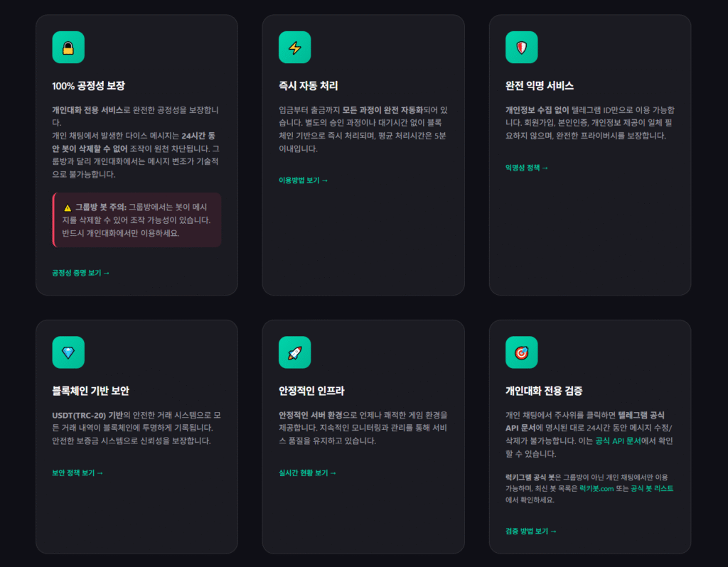 입금이 완료되면 즉시 게임을 시작할 수 있습니다. 주사위를 클릭하면 텔레그램 공식 메시지가 자동으로 표시되어 결과가 투명하게 공개되며, 누구든 실시간으로 공정성을 검증할 수 있습니다. 최소 10 USDT부터 최대 10,000 USDT까지 참여할 수 있어 다양한 이용자층이 만족할 수 있는 환경이 마련되어 있습니다.