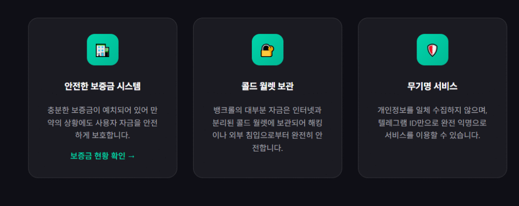 모든 거래는 USDT(TRC-20) 네트워크를 기반으로 하며, 그 내역은 즉시 블록체인에 기록됩니다. 블록체인은 위변조가 불가능한 구조를 가지고 있어, 거래 기록이 영구적으로 보존되며 언제든 검증할 수 있습니다. 여기에 운영사가 사전에 마련해 둔 보증금 시스템이 더해져 자산 안정성이 한층 강화됩니다. 이러한 이중 보안 체계는 단순히 기록을 남기는 수준을 넘어, 실제로 이용자의 자산을 보호하는 장치로 기능합니다. 또한 모든 데이터는 외부에서도 검증할 수 있어 서비스 운영의 투명성을 높이며, 장기적으로 신뢰할 수 있는 운영 환경을 구축합니다.