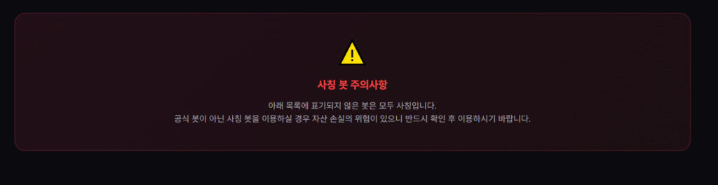 공식 안내에 포함되지 않은 모든 봇은 사칭 봇으로 간주해야 합니다. 이러한 봇은 겉보기에는 유사하게 보일 수 있으나, 실제로는 이용자의 자금을 노리는 수단일 수 있습니다. 반드시 운영 측에서 안내하는 공식 인증 봇만 사용해야 안전합니다.
