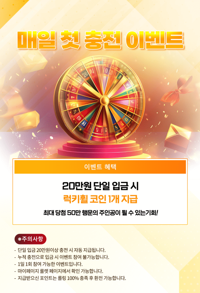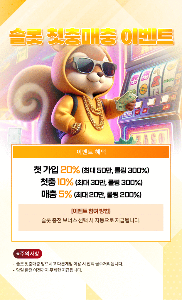 슬롯 첫충·매충 이벤트는 슬롯 전용 유저를 위한 고정형 혜택으로, 가입 초기부터 꾸준한 리워드를 누릴 수 있는 프로모션입니다.