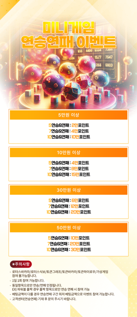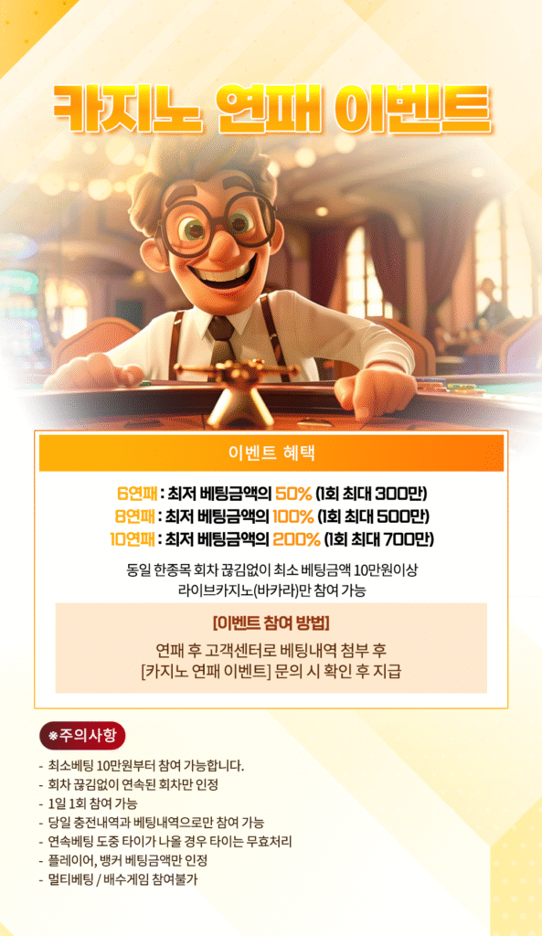 • 6연패 시: 최소 베팅금액의 50% 환급 (1회 최대 300만 원)