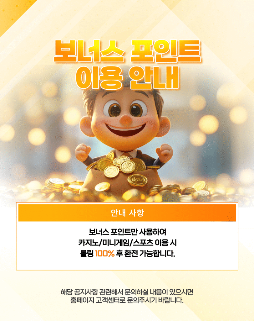 적립된 포인트는 카지노, 미니 게임, 스포츠 등 다양한 게임군에서 자유롭게 활용할 수 있으며, 이용 후에는 명시된 롤링 조건 충족 시 환전이 가능합니다.