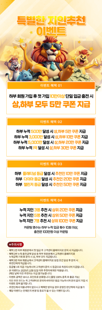 하부 회원이 가입 후 첫 충전 10만 원 이상 단일 입금 시, 상·하부 모두 5만 원 쿠폰을 지급합니다.