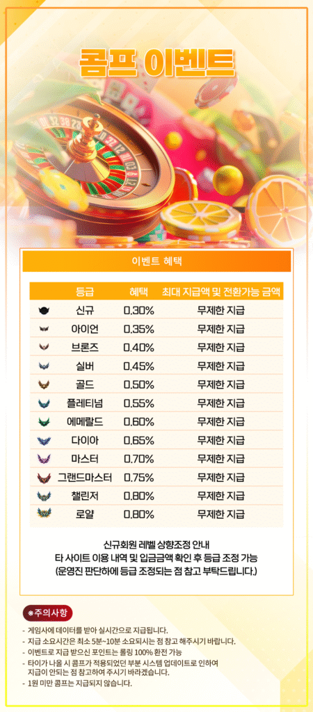 콤프 이벤트는 회원의 이용 실적을 기반으로 한 보상형 프로그램으로, 등급이 높을수록 혜택 비율이 상승합니다.
