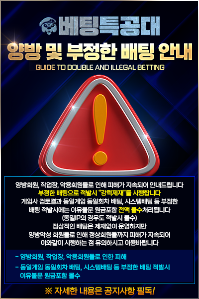 건전한 베팅 환경 조성을 위해 부정행위는 강력히 대응하고 있으며, 이용 전 반드시 공지사항 및 약관을 확인해 주시기 바랍니다.