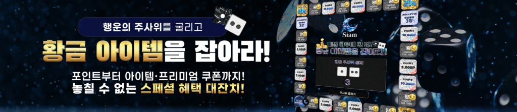 황금 아이템을 잡아라 이벤트는 샴카지노 회원이라면 누구나 참여할 수 있는 주사위 기반의 보상형 프로모션입니다. 주사위를 굴려 나온 숫자에 따라 다양한 아이템과 포인트, 쿠폰이 지급되며, 일부 칸에서는 추가 보너스 기회도 주어집니다. 이벤트는 매일 자정 기준으로 초기화되며, 일정 기간 동안 지속적으로 참여할 수 있습니다.
