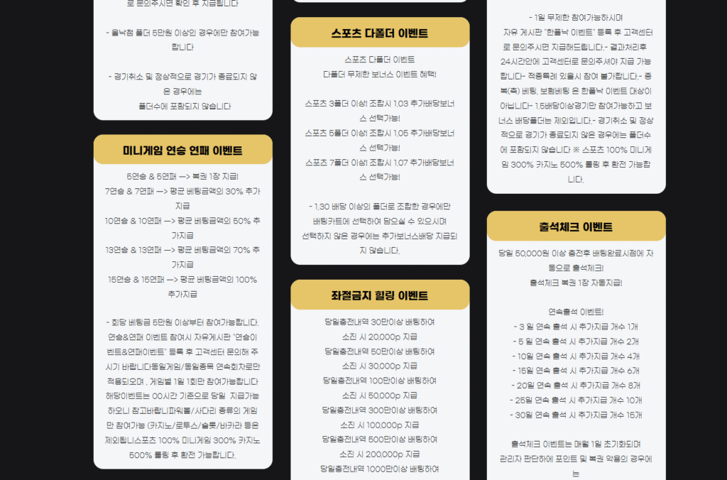 월 누적 충전, 입출금 지연, 야간 적립, 스포츠 미션형 이벤트 등 여러 유형의 이벤트가 상시 운영되고 있습니다. 충전이나 베팅, 출석과 같은 기본적인 이용 흐름 속에서 자연스럽게 참여할 수 있도록 구성되어 있으며, 이용 패턴에 따라 선택적으로 이벤트를 활용할 수 있는 구조를 갖추고 있습니다. 이를 통해 단순 이용 외에도 부가적인 혜택을 함께 고려할 수 있도록 설계되어 있습니다.