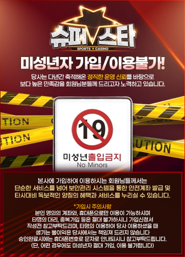 슈퍼스타카지노에서 제공되는 스포츠, 카지노, 미니게임 등 모든 콘텐츠는 성인을 대상으로 구성된 서비스로 운영됩니다. 이용 연령 기준은 명확히 구분되어 있으며, 성인 이용자만 참여할 수 있도록 관리되고 있습니다.