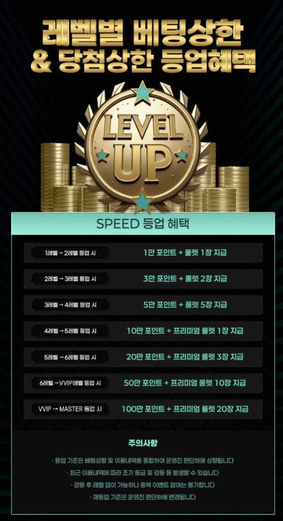 스피드카지노는 회원 활동에 따라 레벨이 상승하는 구조를 갖추고 있습니다. 각 레벨에 따라 콤프 포인트 적립률, 페이백 비율, 보너스 지급 비율, 전용 이벤트 참여권 등이 차등 제공됩니다. 특히 VVIP와 Master 레벨에 도달하면 월간 특별 보너스, 한도 확대, 전용 고객 지원 등 최고 수준의 혜택을 누릴 수 있습니다. 이를 통해 장기 이용자일수록 더 큰 보상과 편의성을 경험하게 됩니다.