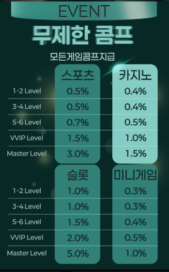 스포츠, 카지노, 슬롯, 미니게임 등 모든 게임 카테고리에 대해 레벨별 콤프율이 적용됩니다. 플레이를 통해 적립된 콤프는 현금 또는 포인트로 전환 가능하며, 레벨이 높을수록 더 높은 비율의 콤프를 받을 수 있습니다.