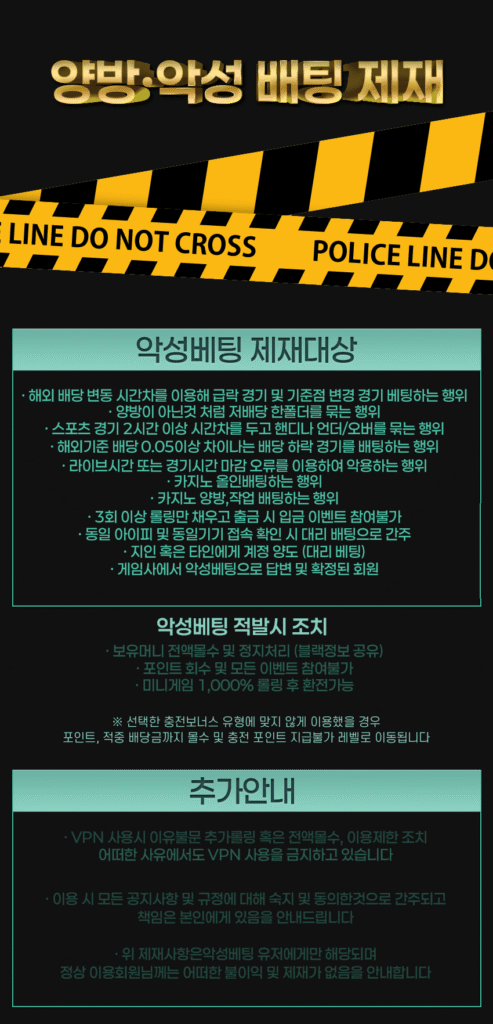 VPN 사용 시 어떠한 사유로도 제재 대상이 될 수 있으며, 이용 제한 조치가 즉시 적용됩니다. 모든 이용자는 공지사항과 규정을 충분히 숙지하고 동의한 것으로 간주됩니다. 정상 이용자는 어떠한 불이익도 받지 않지만, 악성 배팅 적발 시 예외 없이 제재가 이루어집니다.