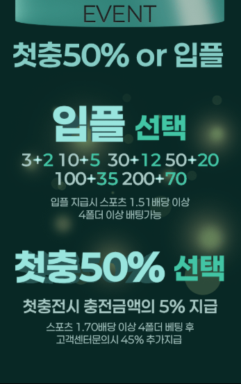 참여자는 첫충 50% 보너스 또는 입플 보너스 중 하나를 선택하여 적용받을 수 있습니다. 각 혜택은 스포츠 배팅 조건에 맞춰 사용 가능하며, 보너스는 베팅 후 조건 충족 시 지급됩니다.