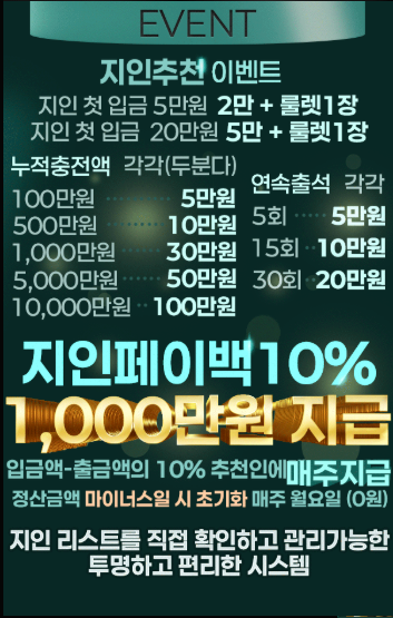 추천받은 지인의 입금액과 출금액의 10%를 추천인에게 매주 월요일에 지급합니다. 해당 금액은 정상금액 마이너스일 시 초기화되며, 제로(0원)에서 다시 시작됩니다.