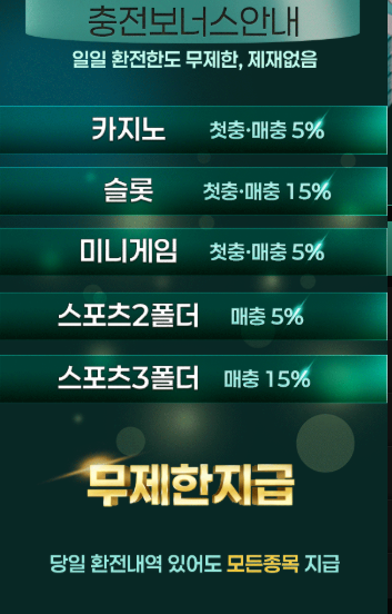 첫충 또는 매충 시 게임 종류별로 지정된 비율의 보너스가 지급됩니다. 보너스는 모든 종목에서 적용 가능하며, 당일 환전 내역이 있어도 지급됩니다. 이를 통해 플레이어는 보다 넉넉한 자금으로 게임을 즐기고, 장기적인 베팅 전략을 세울 수 있습니다.