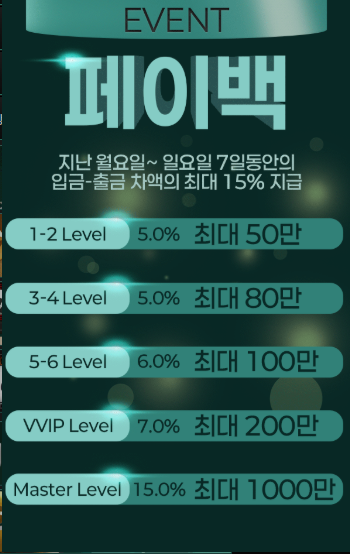 지난 월요일부터 일요일까지 7일간의 입금·출금 차액을 계산하여, 해당 금액의 일정 비율을 페이백으로 지급합니다. 지급되는 비율과 최대 금액은 회원 레벨에 따라 차등 적용됩니다.