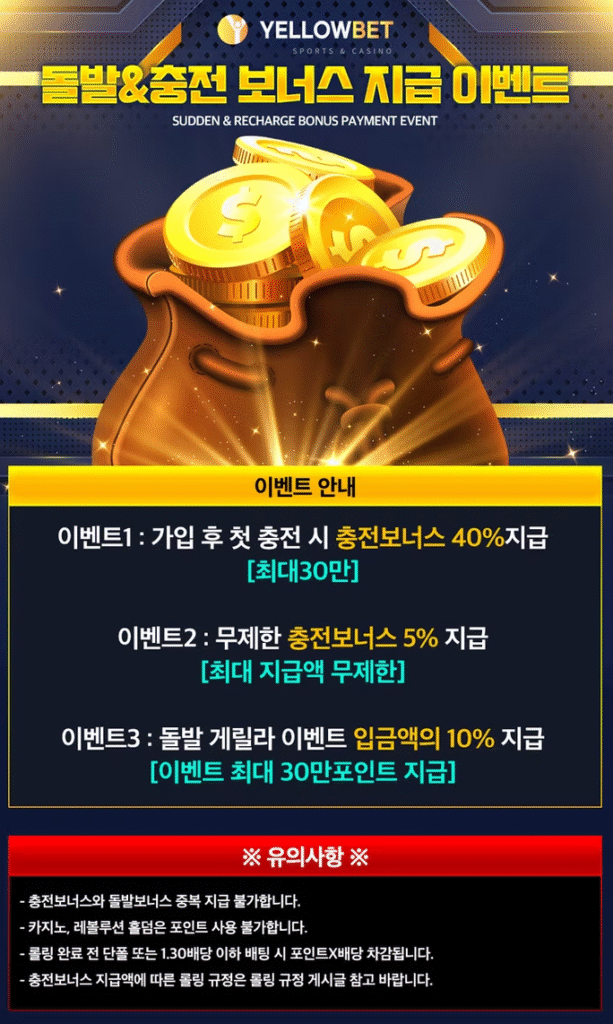 옐로우벳의 돌발 & 충전 보너스 이벤트는 회원들에게 실질적인 혜택과 색다른 즐거움을 제공하는 특별한 기회입니다.