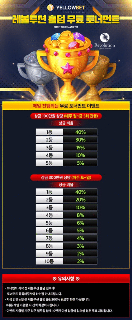 옐로우벳에서는 매일 무료로 참여 가능한 레볼루션 홀덤 토너먼트를 운영하며, 다양한 상금 혜택을 통해 즐길 거리를 제공합니다.