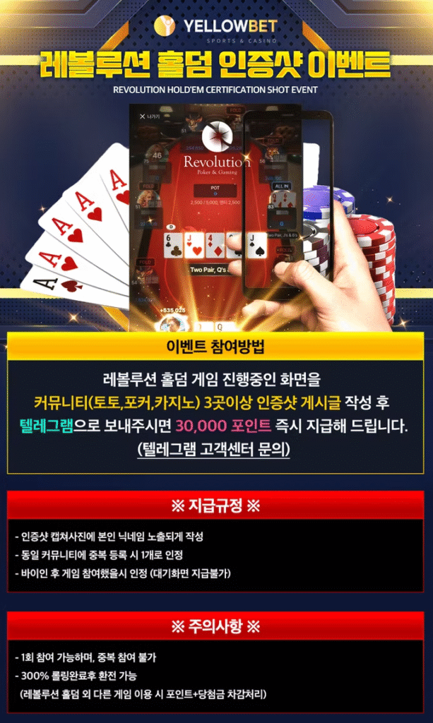 옐로우벳은 레볼루션 홀덤을 즐기는 회원들을 위해 특별한 인증샷 이벤트를 마련했습니다.