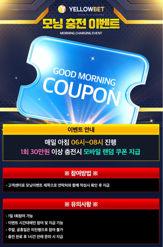 옐로우벳은 아침 시간대 이용자들을 위한 특별한 모닝 충전 이벤트를 진행합니다.