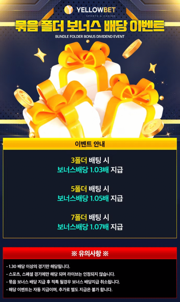 옐로우벳은 다중 배팅을 즐기는 회원들을 위해 묶음 폴더 보너스 배당 이벤트를 운영합니다.