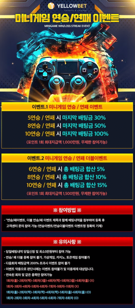 옐로우벳은 미니게임을 즐기는 회원들을 위해 연승과 연패에 따른 특별 보상을 제공하는 이벤트를 마련했습니다.