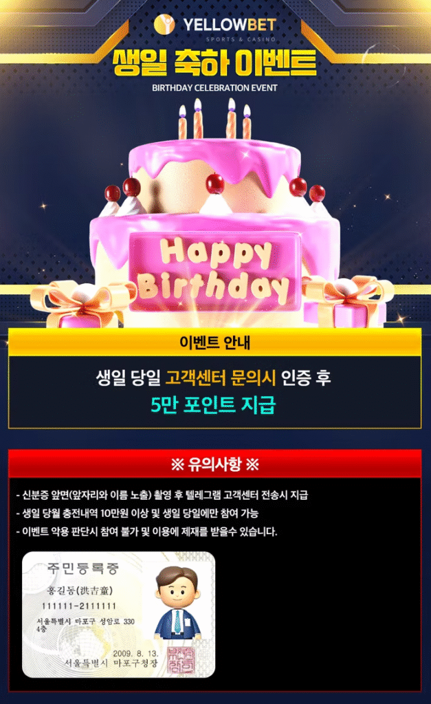 옐로우벳은 회원의 특별한 날을 축하하기 위해 생일 축하 이벤트를 운영하고 있습니다.