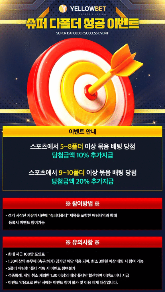 옐로우벳 슈퍼 다폴더 성공 이벤트는 높은 난이도의 도전을 통해 더 큰 보상을 얻을 수 있는 기회로, 전략적 배팅을 즐기는 회원들에게 매력적인 혜택을 제공합니다.