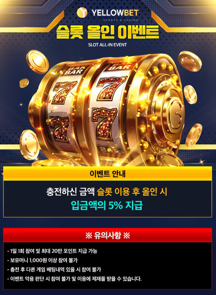 옐로우벳은 슬롯 이용자들을 위한 특별한 올인 이벤트를 마련했습니다.