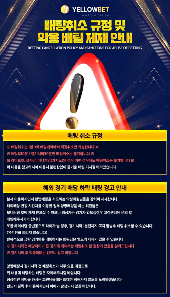 옐로우벳은 배팅 취소와 관련된 규정, 그리고 악용 배팅에 대한 제재 방침을 명확히 공지하며, 이용자가 준수해야 할 기본 사항을 안내하고 있습니다.