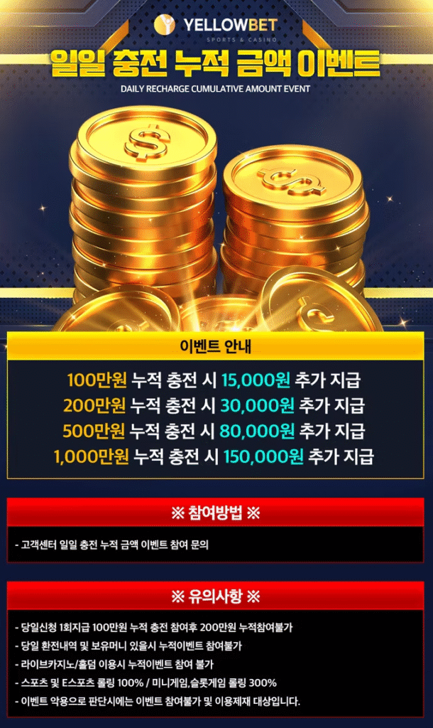 옐로우벳 일일 충전 누적 금액 이벤트는 매일 꾸준히 충전하는 회원들에게 차등 보상을 제공하며, 장기적으로 혜택을 누릴 수 있는 기회를 마련합니다.