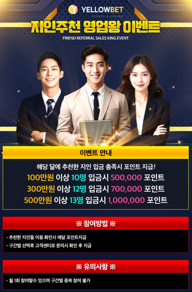 옐로우벳 지인추천 영업왕 이벤트는 회원에게 추가 수익 기회를 제공하며, 활발히 활동하는 회원에게 더욱 큰 보상을 선사하는 이벤트입니다.