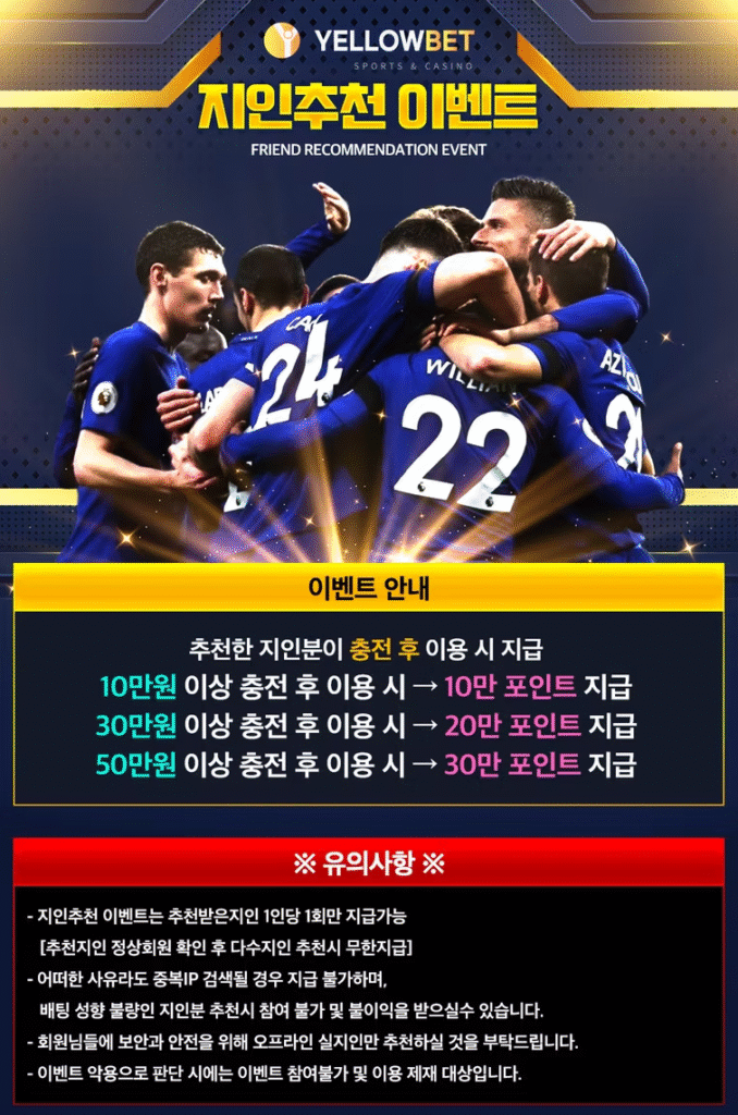 옐로우벳은 회원이 지인을 추천할 경우 추가 보상을 받을 수 있는 지인추천 이벤트를 운영합니다.