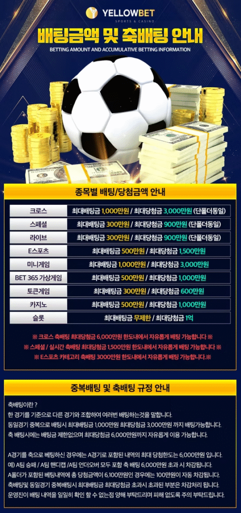 옐로우벳은 동일 경기를 대상으로 여러 방식으로 배팅하는 행위를 축배팅으로 규정하고 있으며, 명확한 한도를 제공합니다.