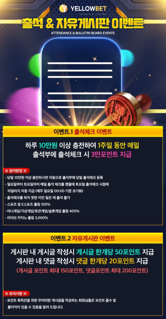 옐로우벳 출석 & 자유게시판 이벤트는 매일 활동을 통해 보상을 받을 수 있는 기회로, 이용자들에게 꾸준한 참여의 동기를 제공합니다.