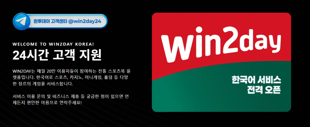 이미지에는 텔레그램 고객센터 계정(@win2day24)도 함께 표기되어 있어, 해당 채널을 통해 문의가 가능함을 확인할 수 있습니다.