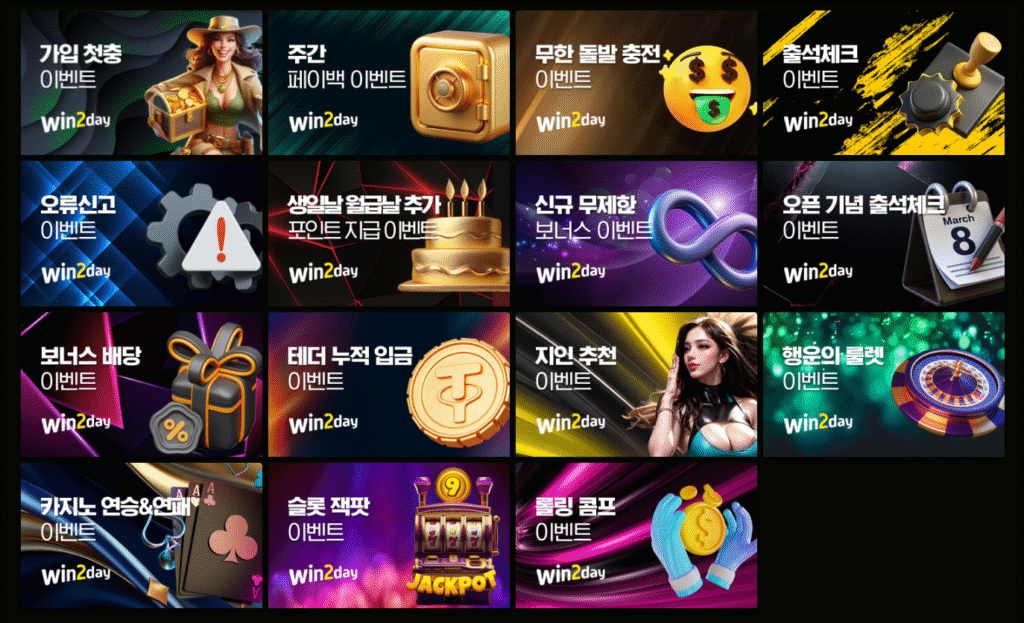 윈투데이는 단일 보너스 중심 운영이 아니라, 가입·충전·출석·추천·카지노·슬롯 참여까지 다양한 구간에 맞춰 이벤트가 구성되어 있습니다. 신규 이용자를 위한 첫충 이벤트부터, 주간 페이백·돌발 충전과 같은 반복 참여형 구조, 그리고 카지노 연승·연패 및 슬롯 잭팟과 같이 게임 흐름에 연동된 이벤트까지 함께 운영되고 있습니다. 특정 한 가지 유형에 집중된 형태가 아니라, 이용 단계에 따라 참여 방식이 달라지는 구조가 특징입니다.