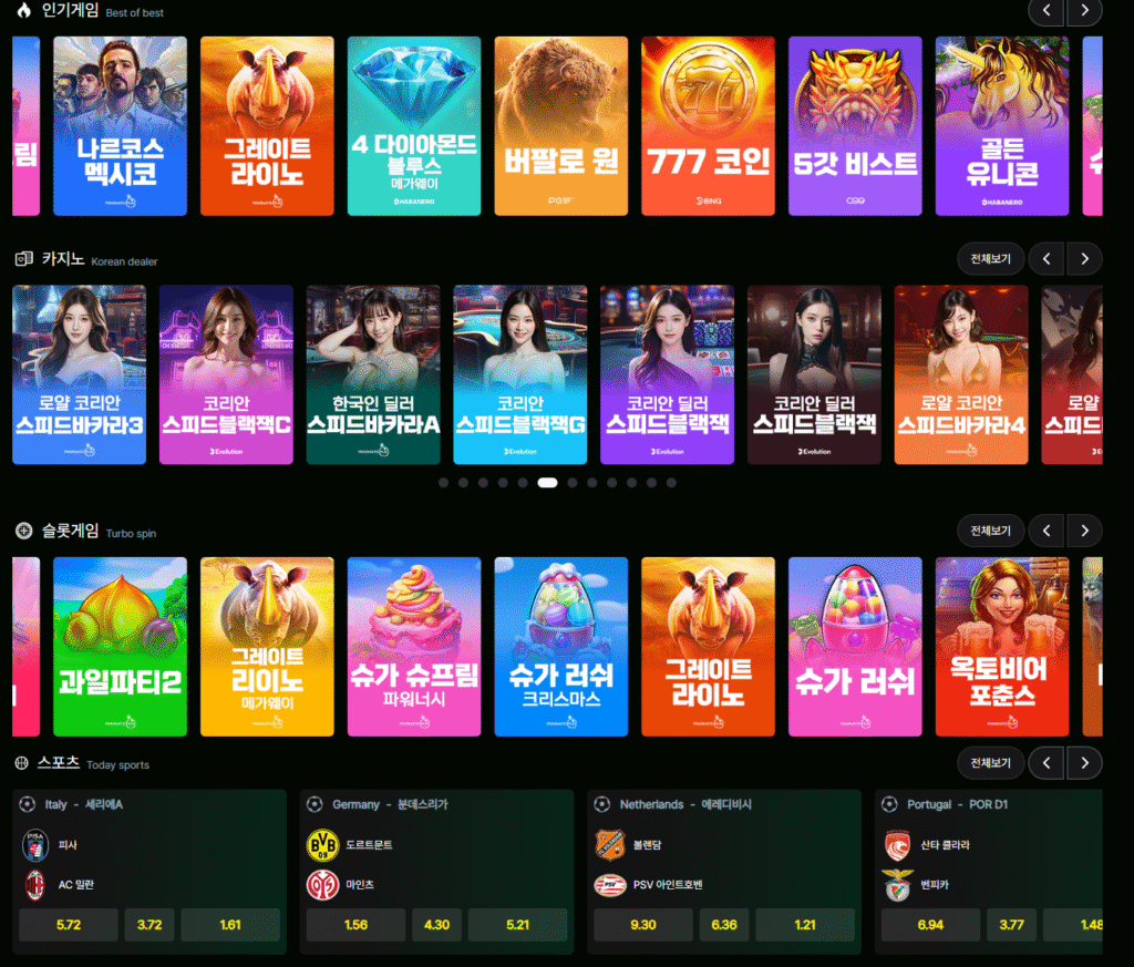윈투데이는 특정 장르에 치우친 구성이 아니라, 스포츠·카지노·슬롯이 균형 있게 배치된 형태입니다. 한쪽에만 이용 흐름이 몰리는 구조가 아니라, 이용자가 선택에 따라 이동할 수 있도록 설계되어 있습니다. 스포츠 중심 사이트와 카지노 중심 사이트의 중간 지점에 위치한 복합형 운영 구조라는 점이 특징입니다.