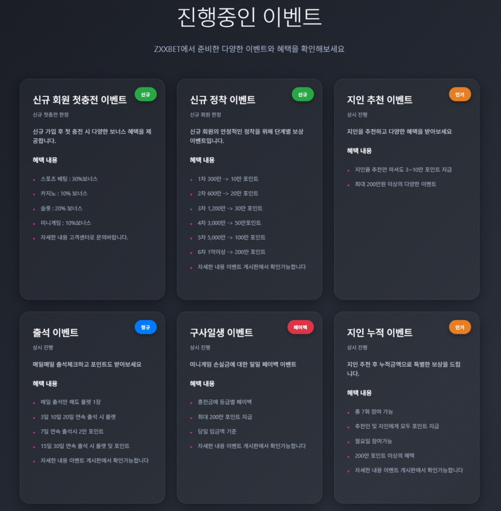 지엑스벳카지노는 매월 새로운 콘텐츠와 프로모션을 추가하며, 시즌별로 대형 이벤트를 운영합니다. 슬롯·스포츠·라이브 카지노 전 카테고리에 걸쳐 신규 게임을 정기적으로 도입하고, 이용자 피드백을 반영해 보상 시스템을 개선합니다. 이와 함께 다양한 리워드, 페이백, 한정 기간 혜택 등이 순환 운영되어 회원들의 지속적인 참여와 만족도를 높이고 있습니다.